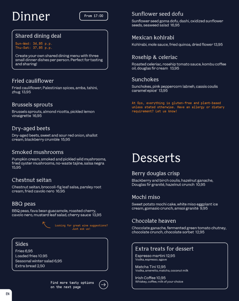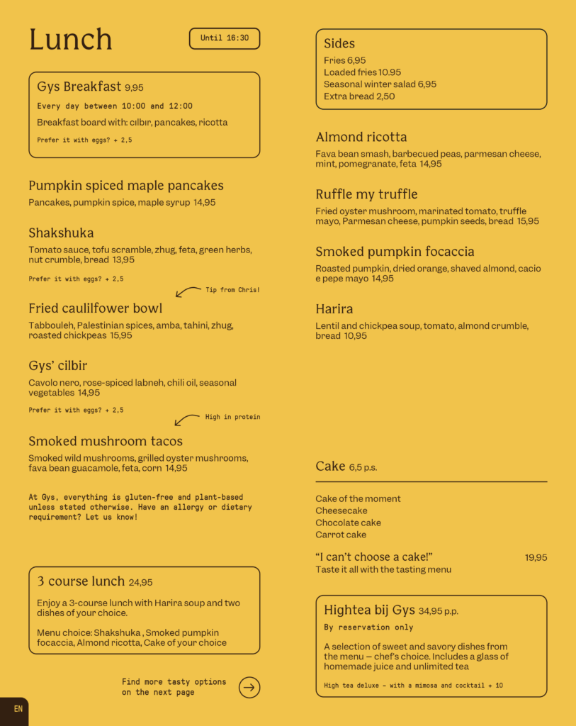 From lunch to dinner: at Gys, you taste how good 100% plant-based can taste. Organic, nutritious, and gluten-free. We try to use seasonal and local products as much as possible. Our menu changes regularly based on fruits and vegetables that are in season at the time.