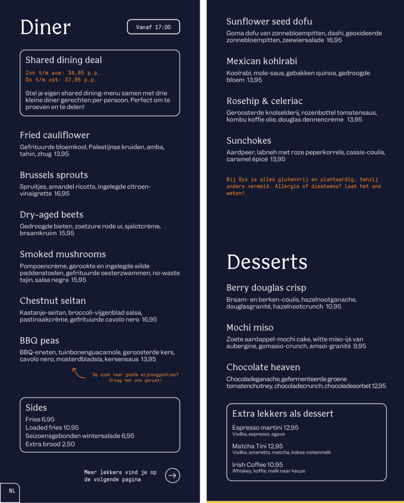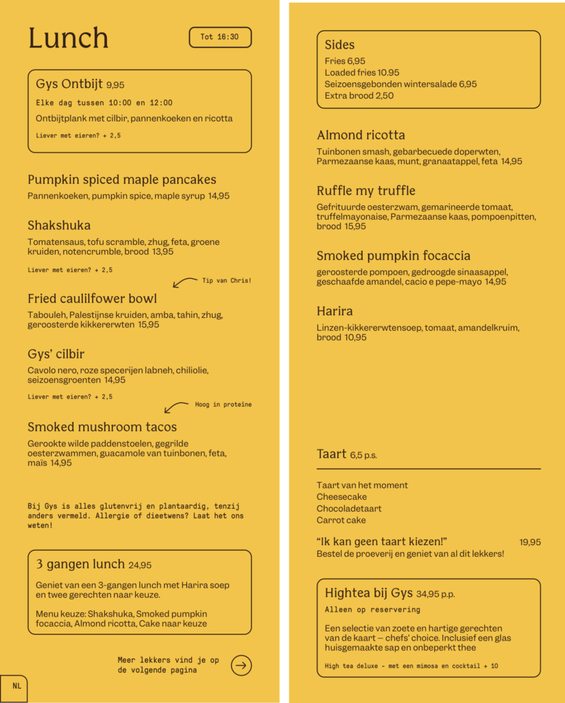 Biologisch, duurzaam maar bovenal ook lekker en gezellig: dit is het gedachtegoed waaruit restaurant Gys in 2014 is ontstaan. Bij Gys geloven we dat een duurzame wereld begint bij hoe we met elkaar en de planeet omgaan, dit doen we in alle aspecten van onze restaurants.